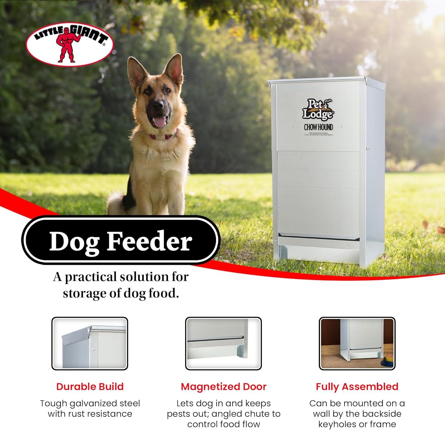 Let storing your dog's food be a problem of the past and say hello to major convenience with the Little Giant Automatic Dog Feeder Chow Hound 4 Pack, a stable automatic pet feeder designed for convenience and optimal pet nutrition. This automatic feeder is a great addition for busy pet owners seeking a reliable feeding solution for their furry friends. You and your dog never had this easy. Safely store dry dog food and feed it from the same chew-proof container. The Chow Hound Automatic Dog Feeder is manufactured from tough galvanized steel for durability and protection from rust. The magnetized door stays shut until your dog nudges it open, keeping unwanted pests out. A specially angled chute provides a steady food flow on demand. Food stays fresh, dry, and pest free. The feeder can be mounted on a wall by the backside keyholes or frame (not included). In addition to serving as an automatic dog food dispenser, our auto pet feeder can also be used as an automatic cat feeder, making it a versatile addition to any pet-friendly household. The feeder is fully assembled and ready to use upon arrival, providing immediate relief for your pet feeding needs. The Automatic Pet Feeder can hold 25 pounds of dry dog food. Great for indoors or outdoors, the Little Giant Automatic Dog Feeder Chow Hound 4 Pack will become your dog's new best friend.