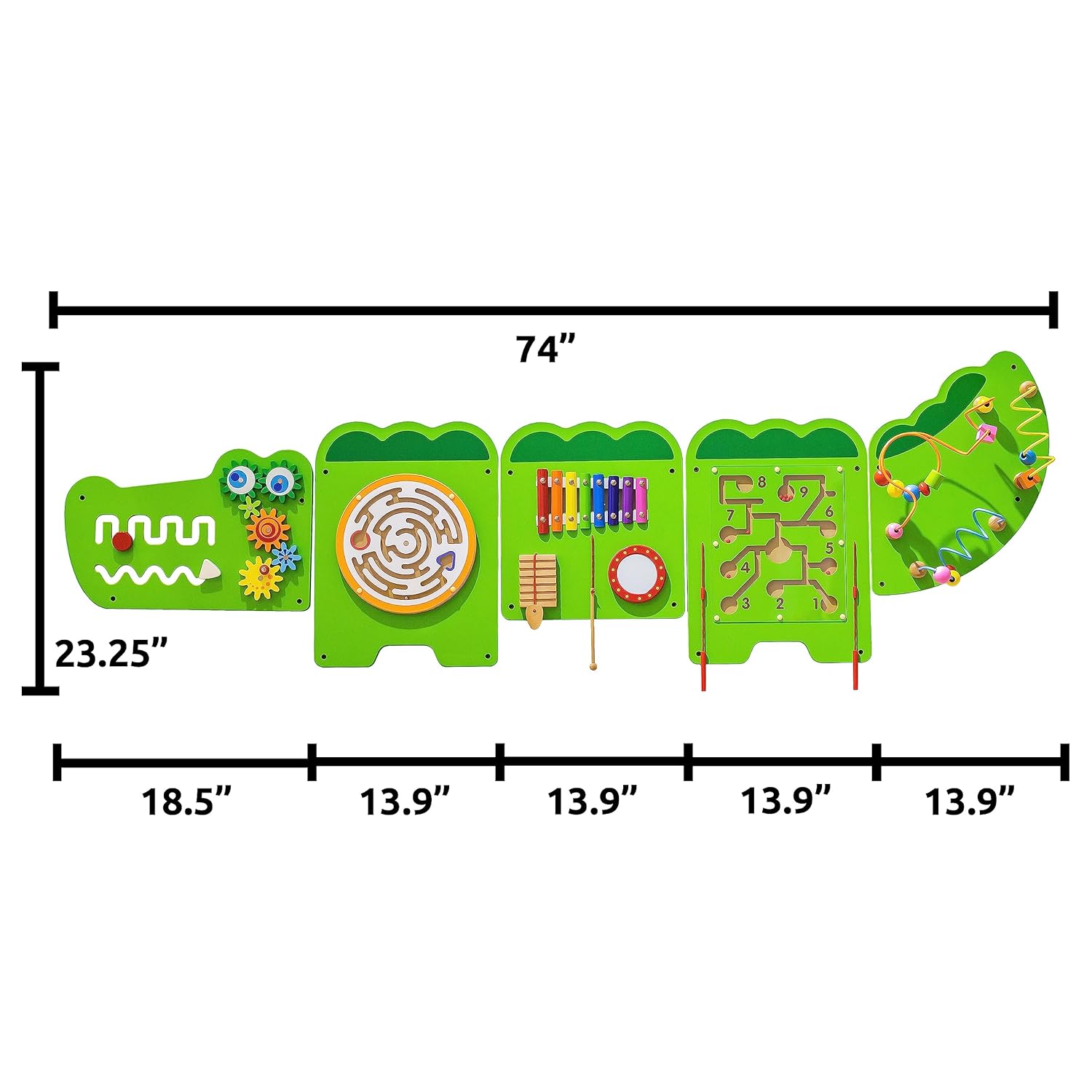 SPARK & WOW Rainbow Activity Wall Panels - Ages 18m+ - Sensory Wall Toy - 10 Activities - Busy Board - Toddler Room DecorThe Rainbow Activity Wall Panels help develop fine motor, collaborative play, communication, language, shape-recognition skills and more. This toddler busy board is tested to the highest consumer standards. This activity center includes fixing holes and attachment screws for easy assembly. Mount it at just the right height for little learners! Decorate bedrooms, classrooms, waiting rooms or play areas without taking up space on the floor. The panels contain interlocking cogs, a weather wheel, a bead wheel, a thermometer slider, a season wheel, a shape puzzle, a wire slider, a sun/moon slider, a xylophone and mirrors(concave and convex). | Constructed with MDF. | The panel includes its own fixing holes and comes with screws. | Size: 5'3.7"L x 32”H | The maximum depth it protrudes from the wall is 4".SPARK & WOW Crocodile Activity Wall Panels - Ages 18m+ - Montessori Sensory Toy - 8 Activities - Busy Board - Toddler Room DecorThe Crocodile Activity Wall Panel features 11 different activities to develop fine motor skills, hand-eye coordination and descriptive language. This toddler busy board is tested to the highest consumer standards. All 5 panels include fixing holes and attachment screws for easy assembly. Mount it at just the right height for little learners! Decorate bedrooms, classrooms, waiting rooms or play areas without taking up space on the floor. Give children a place to pay together and socialize. Includes: percussive instruments, mirror, magnetic pen and balls, mazes, threading activities, rotational pieces and interlocking cogs. || Size of mounted panels: 6'2"L. Height is 24".